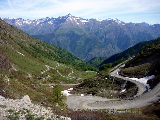 Este día amenazaba lluvia y por suerte ha sido todo lo contrario. Estoy ya en Italia en el Pueblo de Dronero donde queremos llanear pasando de un valle a otro por la cota baja donde no deja de subir y bajar rampas que calientan las piernas. Legamos hasta el pueblo que habíamos pasado el dia de antes (Vinadio), Damos la vuelta y empiezo a subir un larguísimo y encantador valle con una carretera muy estrecha que en muchos tramos está cortada por derrumbamientos, la parte de arriba está cortada por la nieve, reviento entre las piedras caídas una rueda donde arreglo con algo de frio en mis manos. No se ve a nadie por estos lugares y tengo que andar con mi bici al hombro alrededor de unos 500m para llegar al collado y puerto de Valcavera (2500m) donde hay una bonita estatua que hace homenaje a Marco Pantani. El puerto de bajada sigue cerrado por la nieve y empieza a llover, unos ciclistas llegan por este lado con las bicis de la mano por lo que me alegro y me tranquilizo. Si ellos han subido yo podre bajar. Otro larguísimo y encantador valle me hace disfrutar de estos paisajes de Alpes Italianos, Así llego de nuevo a la zona de Dronero, Lugar de donde había partido. Con 7h de pedaleo, 133km y 2655m de subida acumulada hemos acabado con este espectacular día.