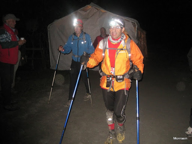 LA BALME, me tomo un caldo, y me sienta mal. Le digo a Enrique que se vaya, que hasta que no se me pase el mal rato no sigo. Tras calentarme un rato en la hoguera, salgo despacio para arriba, pero enseguida vomito, he vomitado todo el caldo. Luego Enrique me diría que sería un vaso de agua con sales muy fuerte, que no lo habían batido bien. El caso es que comienza mi calvario con la alimentación en esta Ultra. Ya no me pasaría en forma la comida, tendría que parar mas rato de lo necesario en los avituallamientos para intentar comer un poquito, pues enseguida se me hacía bola la comida y debía escupirla. Luego me alimentaría de Coca-Cola, Agua, Agua con Sales y algo de comida que lograba pasar a duras penas, carne de membrillo que llevaba yo, algún embutido sin pan, alguna galleta, y los 7 geles energéticos que llevaba. Hasta las barritas las tenía que pasar muy poco a poco. Amanece subiendo