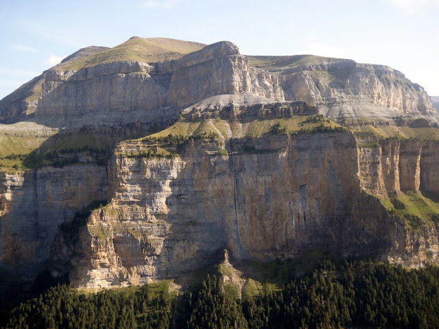 Así llegamos al fondo del valle para tras cruzar un puente de madera poder llegar enseguida a la pradera de Ordesa. Si paras a descansar y miras hacia arriba y ves los murallones por donde has pasado te parecerá increíble decir. ¿Allí he estado yo hace unas horas? Increíble pero cierto.