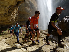 La senda a Osan cruza por un túnel, debajo de la carretera de Sabiñánigo a Yebra de Basa, y va por la izquierda de una Nave, subiendo por un barranquillo seco. Siguiendo los mojones llegamos a la carretera de Osan. Enseguida cruzamos el puente, subimos por una senda vertical a coger una pista, y llegamos a la carpa tras haber recorrido 67km. y 2.100 metros de desnivel acumulados positivos, en 10h. 50m. Saludamos a los conocidos y vamos a coger el dorsal y cambiarnos de camiseta para iniciar la salida de la carrera “Osan Cross Mountain”, 17km. y 1.000m. positivos. Pero esto ya es otra historia.