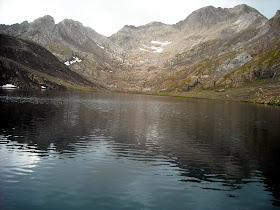 Tras tomar un respiro y volver a contemplar el fantástico paisaje que nos rodea, nos lanzamos valle abajo hasta llegar por un terreno pedregoso mezclado con el pastizal que va asomando entre las rocas y el cual nos deja correr. Así llegamos al último Ibón (Estany Dellui).